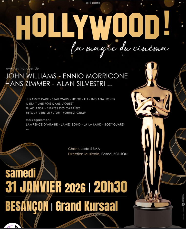 The 55 musicians of the Orchestre d'Harmonie de Pin-Emagny join forces once again with singer Jade REMA for an exceptional concert dedicated to the world of Hollywood cinema. From fantastic lands to distant galaxies, from unforgettable romances to the greatest heroic epics, each note will conjure up an image, an emotion, a memory.